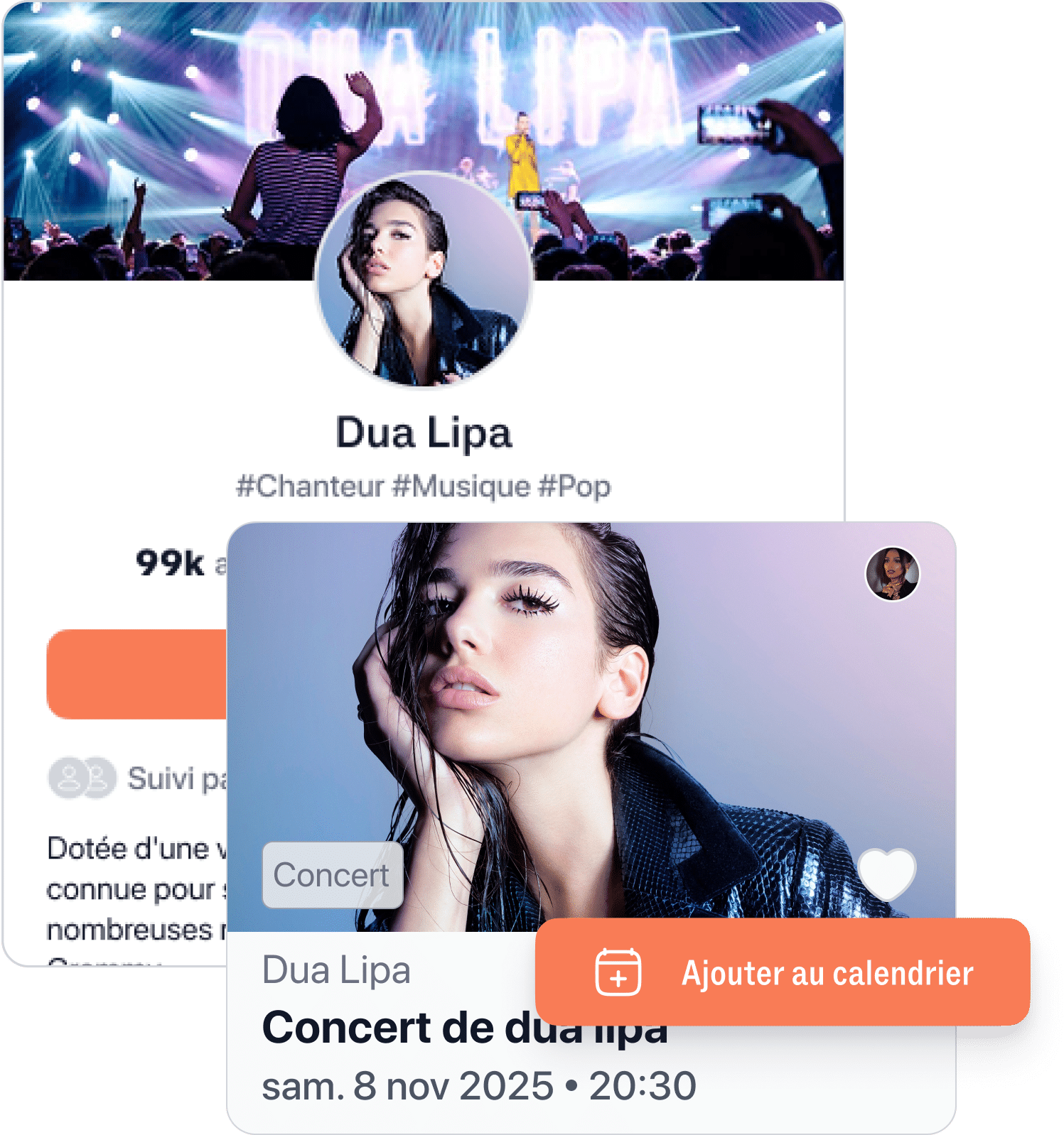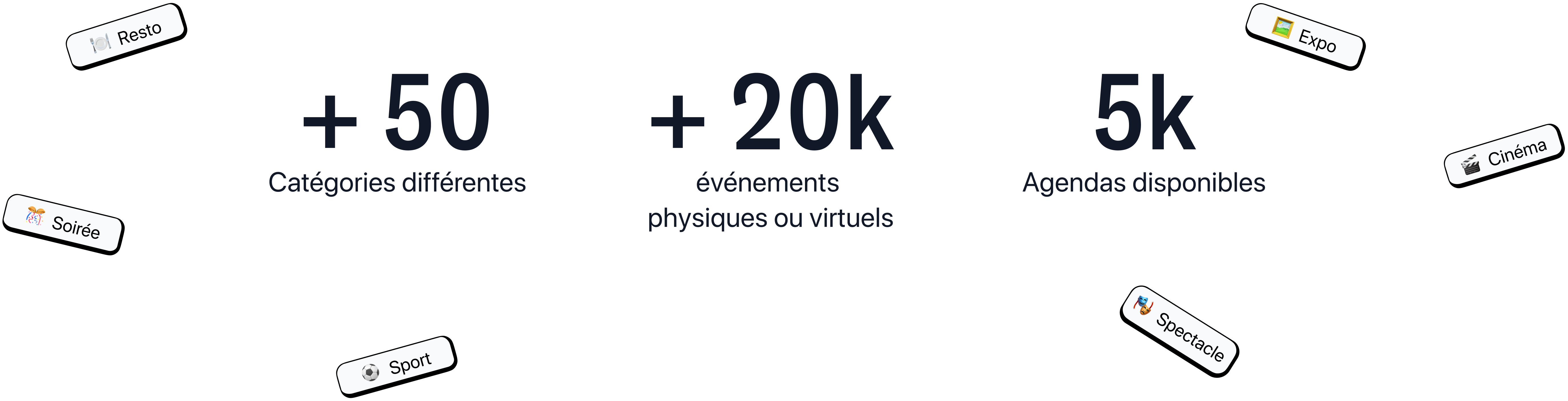20 000 événements, qu'ils soient physiques ou virtuels, tous réunis sur une seule appli ! Que ce soit un match de foot, une expo, une sortie d’album, ou un festival, tout est là.